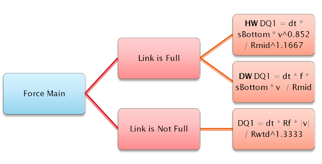 You can model Force Mains in SWMM 5 using either Darcy Weisbach or Hazen Williams as the full pipe friction loss method (see Figure 1 for the internal defintion of full flow).   No matter which method you use for full flow the  program will use Manning’s equation to calculate the loss in the link when the link is not full (see Figure 2 for the equations used for calculating the friction loss – variable dq1 in SWMM 5).   The regions for the different friction loss equations are shown in Figure 3.