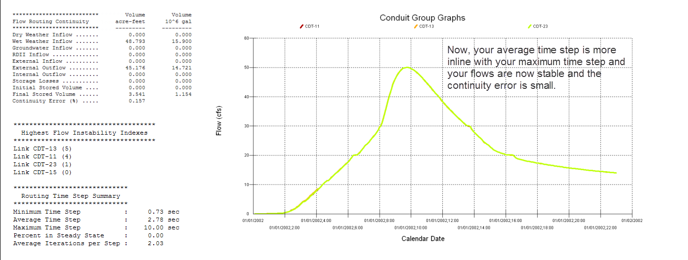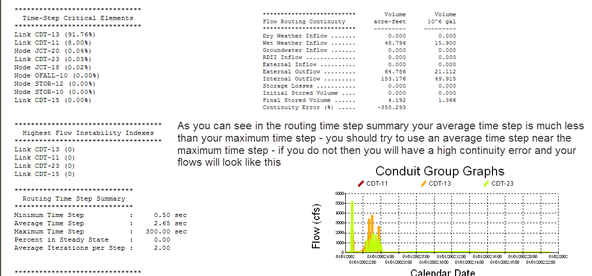 Step 2: Run your model with a time step of 10 seconds and check the flows and the continuity error. In this case by using a maximum time step near the average time step you got rid of the continuity error and the unstable link flows.