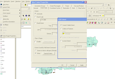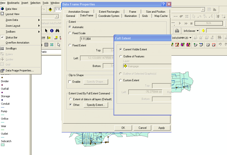 How to redo the Arc GIS Extents in InfoSWMM Problem: The network looks very small when you zoom out to the maximum extents of the window Step 1: Zoom out a few times to a visible network Step 2: ArcGIS View/Data Frame Properties/Other / Current Visible Extent will fix your network view.