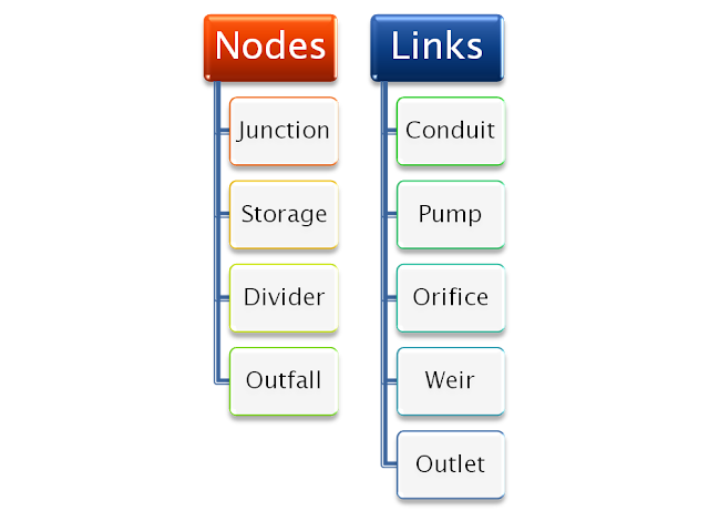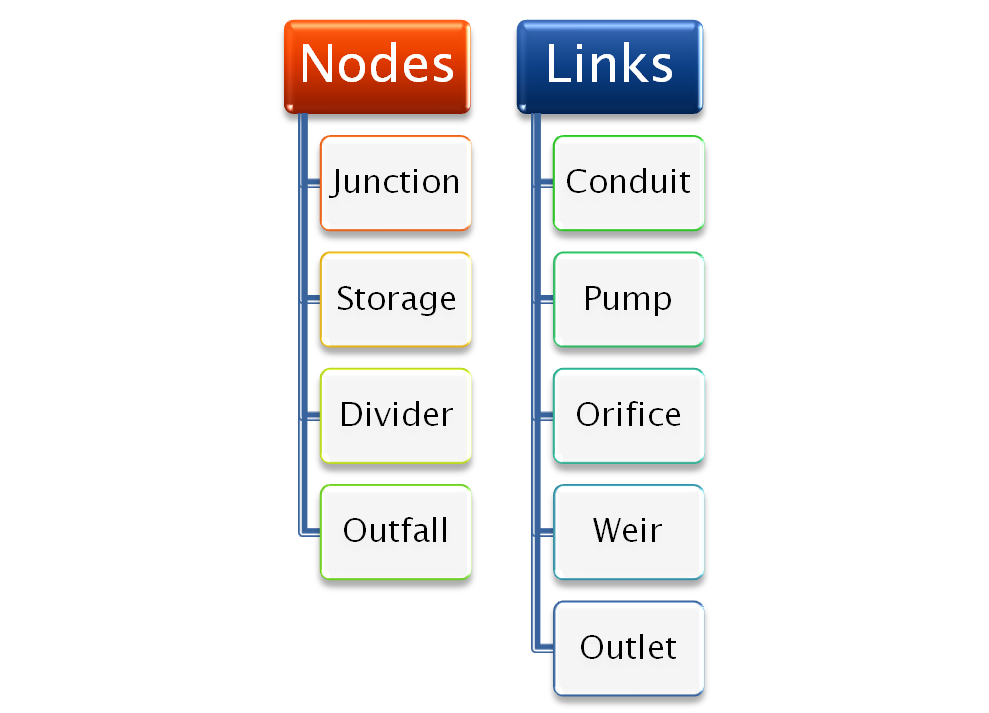 The main objects in a SWMM 5 drainage network are the nodes and links. Nodes are Junctions,  Storages,  Dividers and  Outfalls.  Links are Conduits, Pumps, Orifices, Weirs and Outlets.  There is one type of junction but 5 types of Oufalls, 3 types of Storages and 4 types of Dividers. The dividers can be used in the dynamic wave solution of SWMM 5 but only divide the flow in the kinematic wave solution.