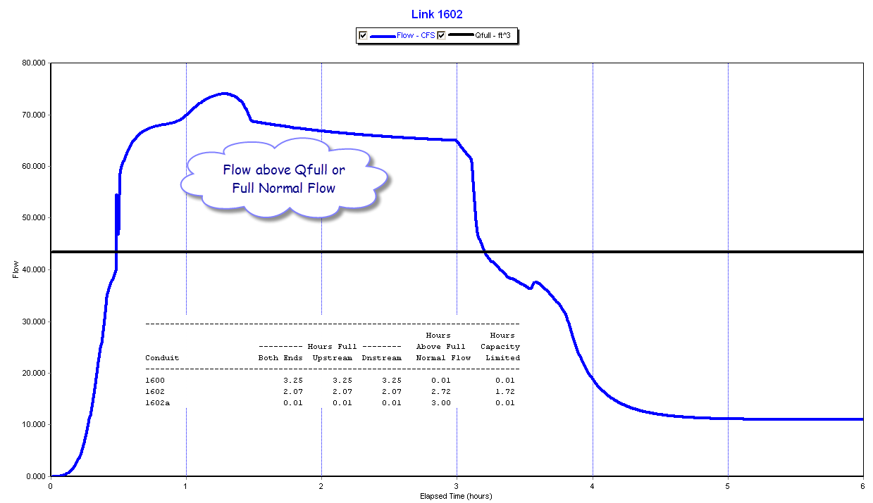 The Conduit Surcharge Summary Table in the Report text file or Status Report lists a column of results called “Hours above Full Normal Flow”. This is the number of hours the flow in the link was above the REFERENCE full flow as calculated by Manning’s equation. The flow in the link can be above full flow even if the link is not a full depth if the head difference across the link is high enough. The head difference is the water surface elevation at the upstream end of the link minus the water surface elevation at the downstream end of the link. The capacity or d/D of the link varies from 0 to 1 with 1 being a full pipe or link.